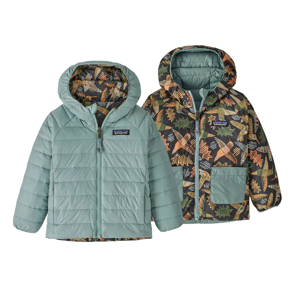 Keep them warm with the Baby Reversible Down Sweater™ Hoody. It has a lightweight, windproof 1.6-oz 30-denier NetPlus® 100% postconsumer recycled nylon ripstop shell made from recycled fishing nets to help reduce ocean plastic pollution; with a durable water repellent (DWR) finish made without perfluorinated chemicals (PFCs/PFAS). It reverses to a contrasting print made of 100% recycled polyester taffeta fabric. Insulated with 700-fill-power 100% Recycled Down (duck and goose down reclaimed from down products) for compressible warmth.