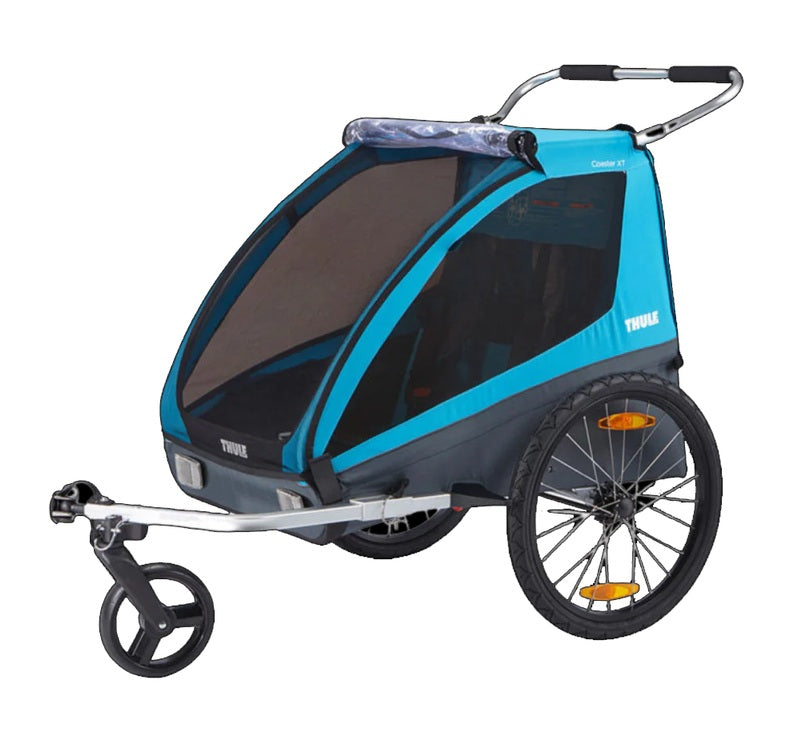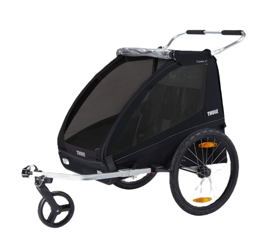 This bike trailer includes a biking and basic strolling kit?, an adjustable handlebar? and extra storage compartment. The simple, compact fold? makes it easy to transport. Thule Coaster XT uses the patented ezHitch for easy and quick attachment to bike, making it great for both busy commutes and relaxing recreation.