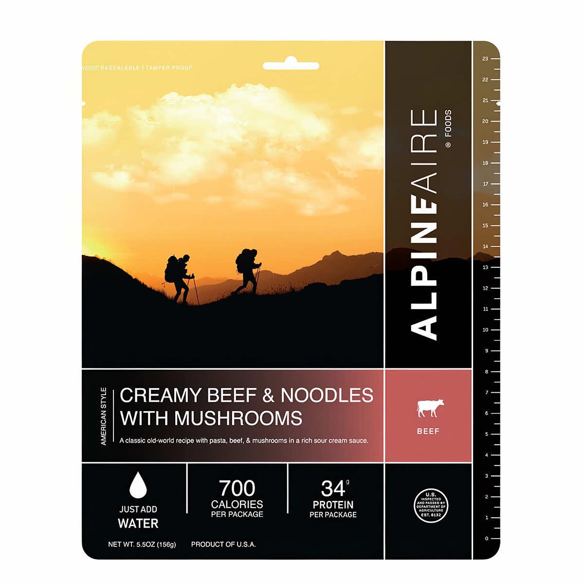 The Alpineaire Creamy Beef & Noodles with Mushrooms is pasta, beef, & mushrooms in a rich sauce.