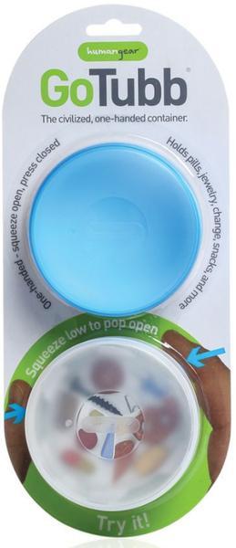 Patented worldwide, the GoTubb features an ingenious design that allows you to open and close it with one hand only. Just squeeze the sides and the lid is released. To close, simply press back on. The GoTubb works great with pills, knick-knacks, snacks, vitamins, change, bits-n-pieces, you name it. A recessed, textured labeling area resists being rubbed off. The transparent tops let you see what's inside without opening them.
