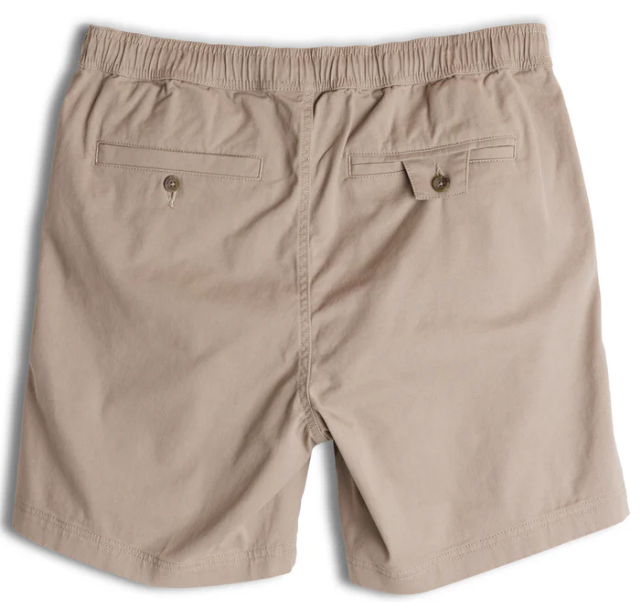 Regular fit, elastic waist short with custom rope draw cord, faux fly, reinforced front pockets with inlay gussets and right wallet stay, thigh welt pocket, back welt pockets with button tab closure, double needle reinforced seams.