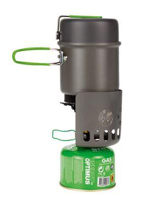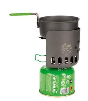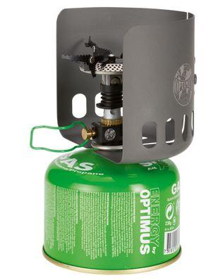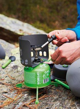 Lightweight, hard anodized aluminium clip-on windshield for use with canister mounted stoves. Increases stove efficiency and substantially reduces gas consumption. Fits every gas canister according to EN417 and pots with max. diameter 11 cm (4.3 in). Compatible with standard pots and high profile heat exchange pots. Easy packability (fits around the Optimus Terra Weekend HE pot).
