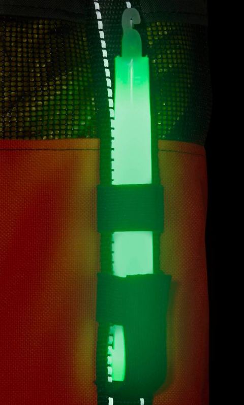 - An elastic loop and pocket will hold a glow stick or “chem light” for low light rescues.