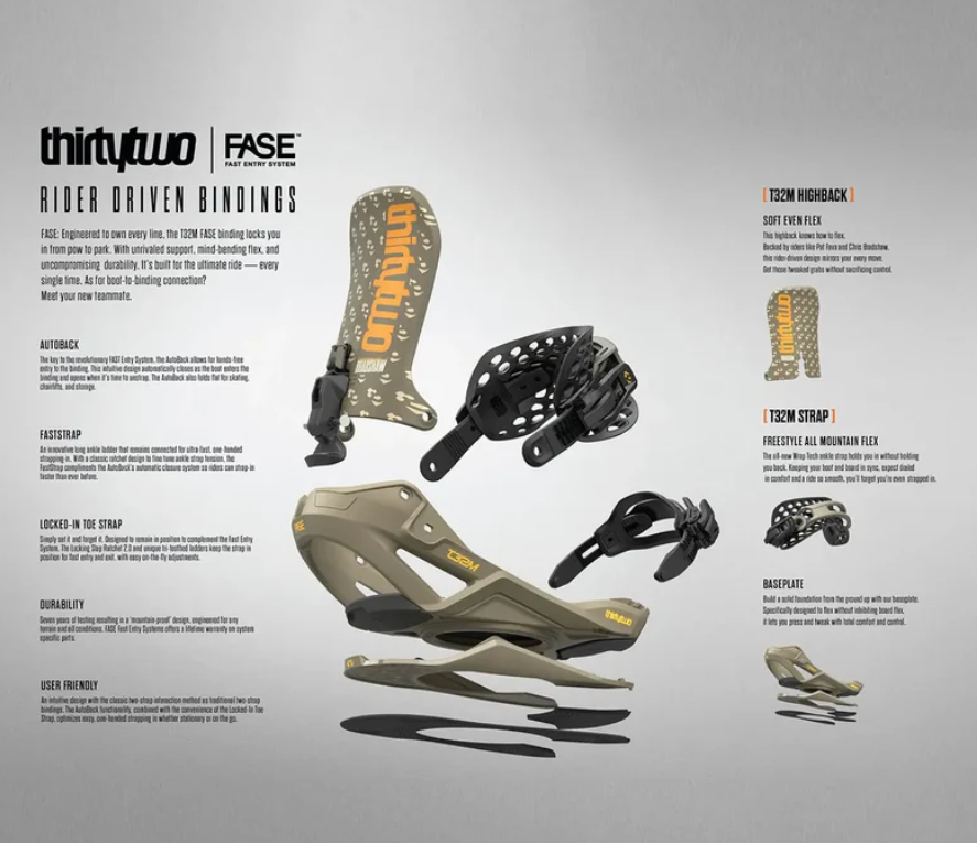 Engineered to own every line, the T32M Fase Binding locks you in from pow to park. With unrivaled support, mind-bending flex, and uncompromising durability, it's built for the ultimate ride, every single time. As for boot-to-binding connection? Meet your new teammate.