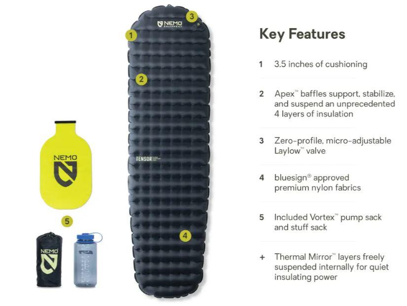 Tensor™ Extreme Conditions represents a new chapter in NEMO backcountry pad innovation. With its Apex™ baffle internal structure, Tensor EC toasts the competition, achieving an 8.5 R-value and a mind-bending warmth-to-weight ratio. Now the warmest, most insulating ultralight pad on the market, it’s also still the quietest pad in its class. (Dreamy, right?)