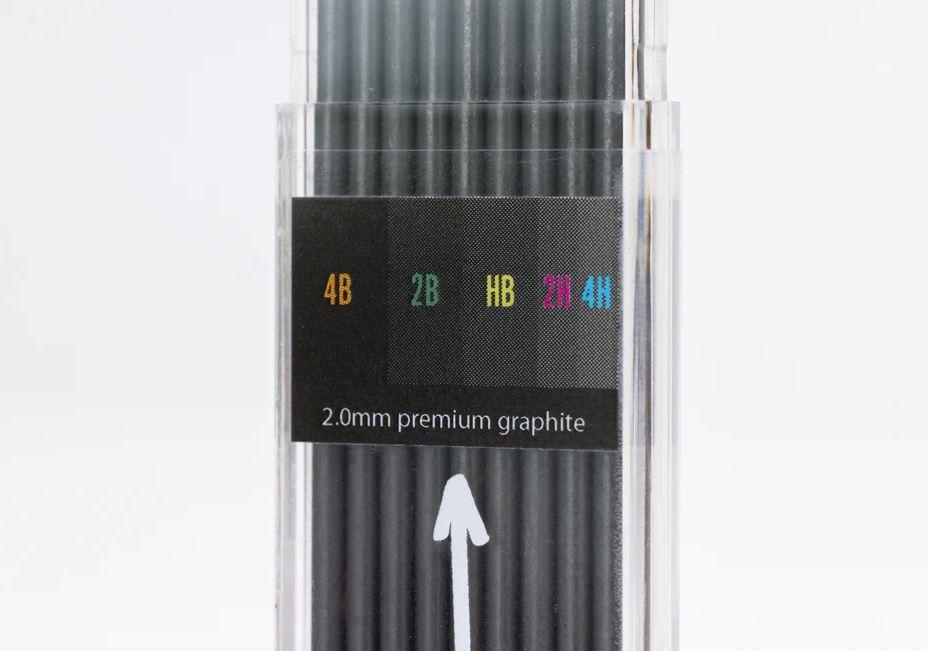 - Set of 9 2.0mm graphite lead range (4B, 2B, HB, 2H, 4H) with color labeling.