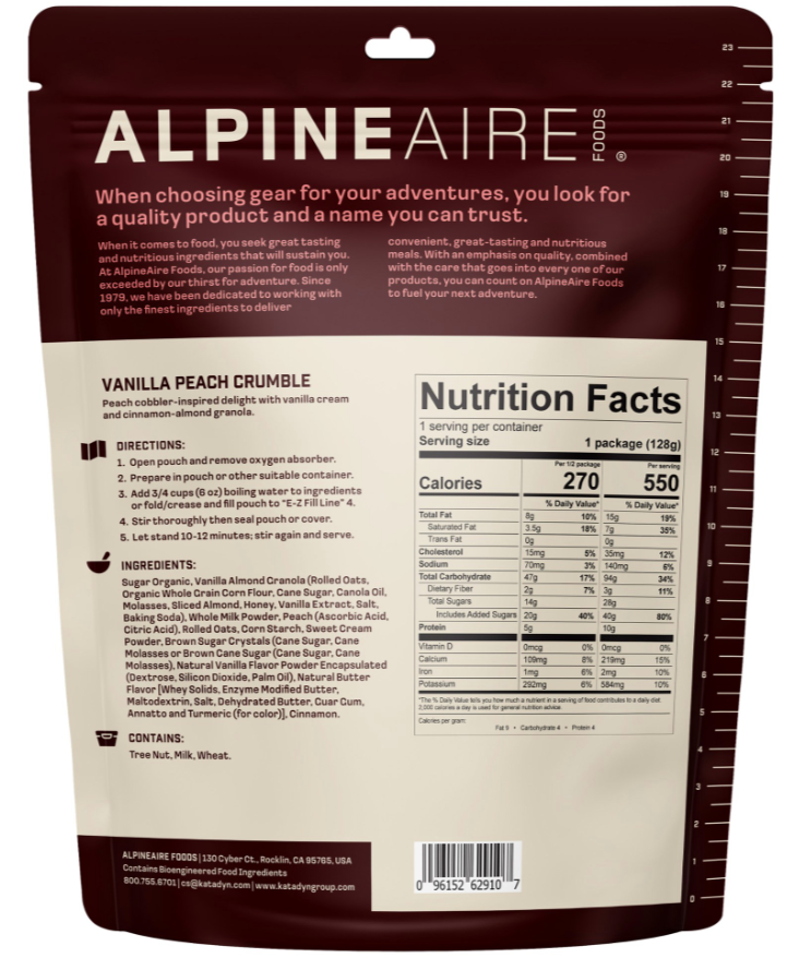 Enjoy the peach cobbler–inspired AlpineAire Foods Vanilla Peach Crumble after a day on the trail. It pairs vanilla cream and cinnamon-almond granola to create an irresistible treat.