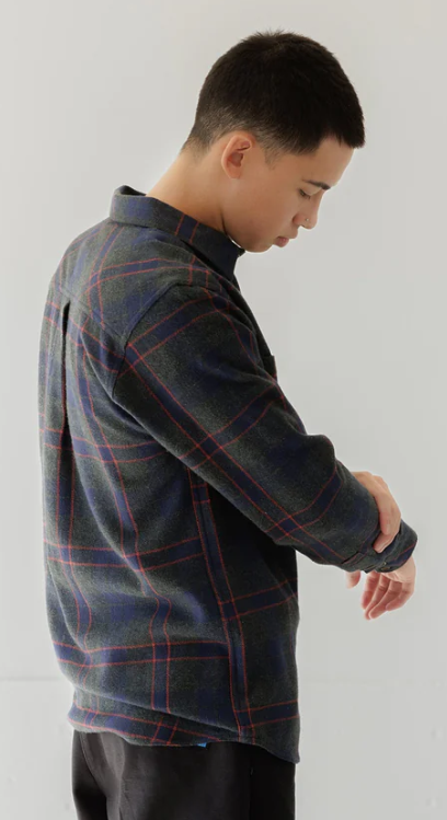Casual fit, long sleeve button up shirt, stand collar with recycled polyester logo jacquard tape, two chest pockets with button closure, herringbone lined adjustable cuffs, back bias cut yoke with center back box pleat, 25% certified recycled polyester faux wood buttons, curved hem.